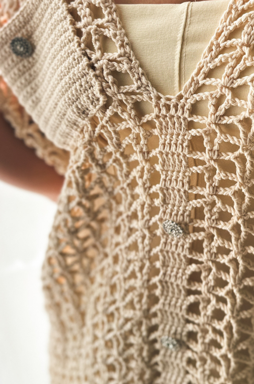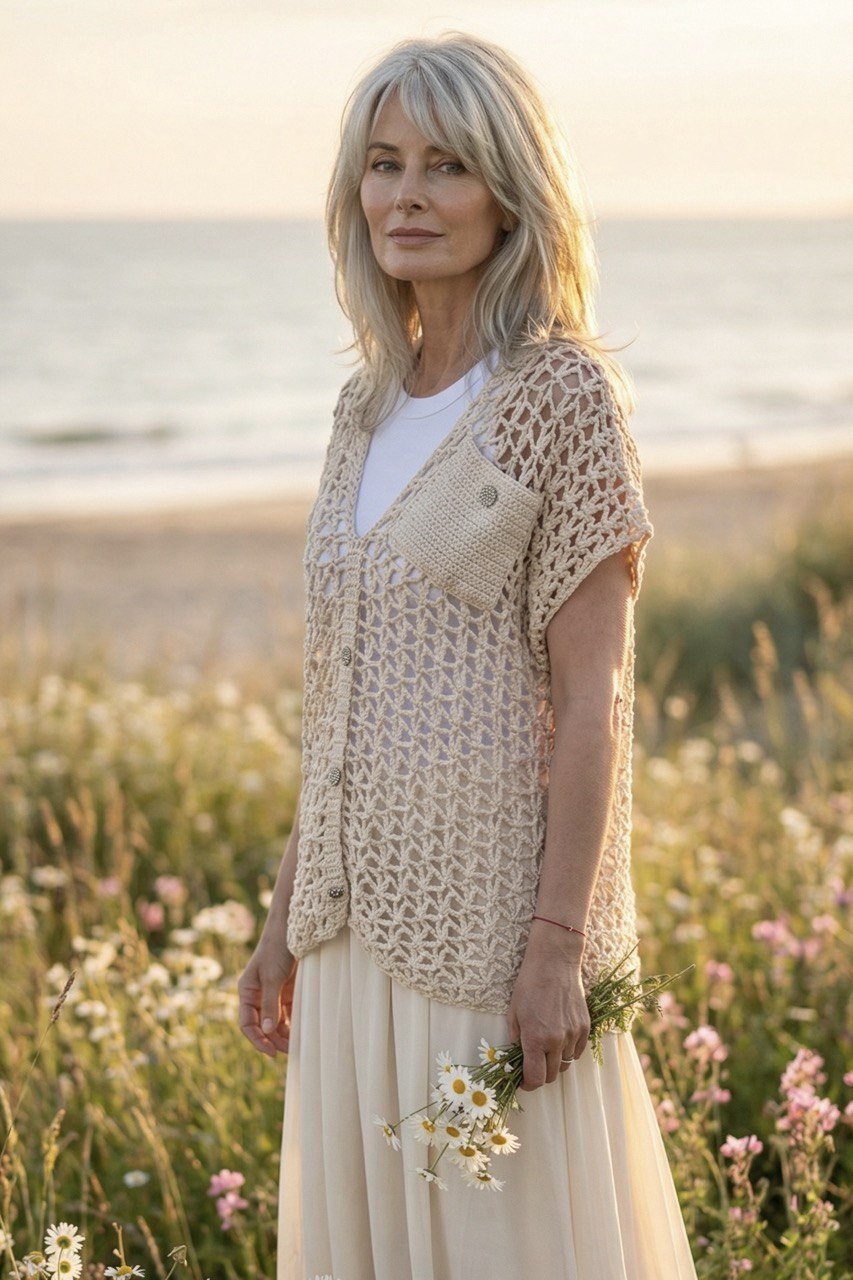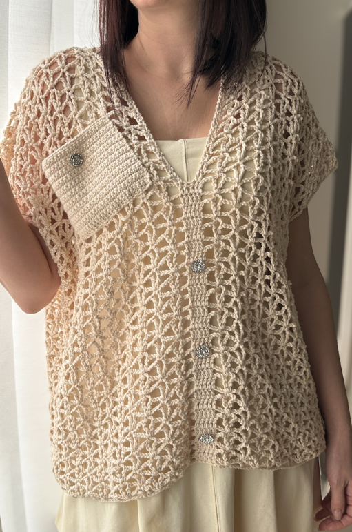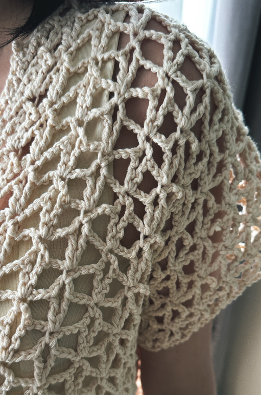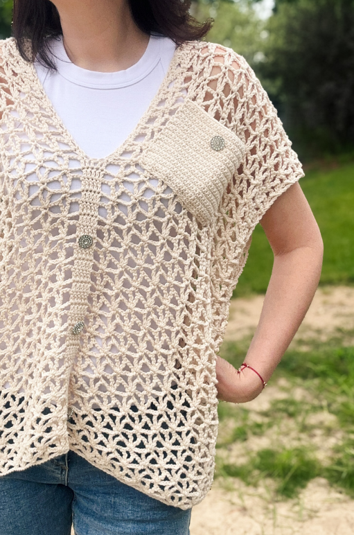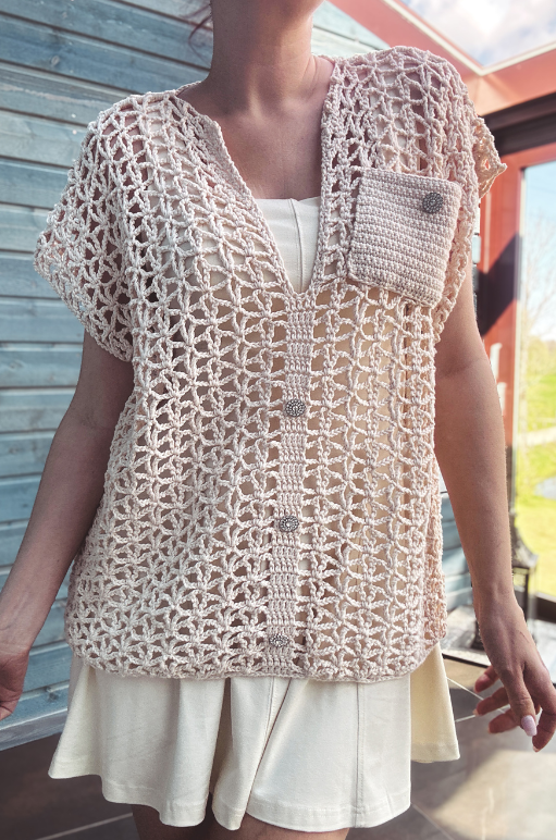 The Soft Harmony Cover-Up is an elegant and stylish layering piece that works up quickly, thanks to the use of long stitches. Designed for both comfort and sophistication, this cover-up features an airy lace texture that drapes beautifully, making it perfect for warm days or as a chic accent to any outfit. Worked bottom-up in flat rows, the construction is simple, resulting in a well-structured yet effortlessly flowing garment. Whether worn over a dress, paired with casual outfits, or styled as a beach cover-up.